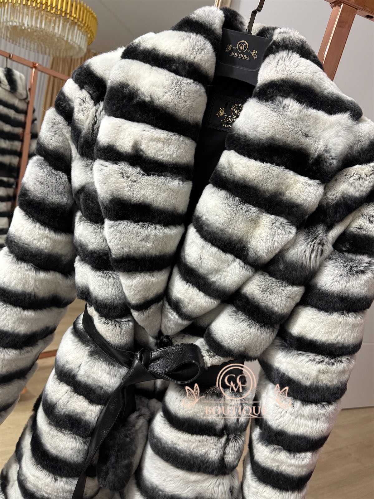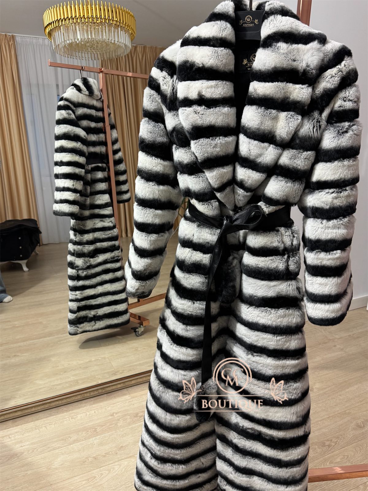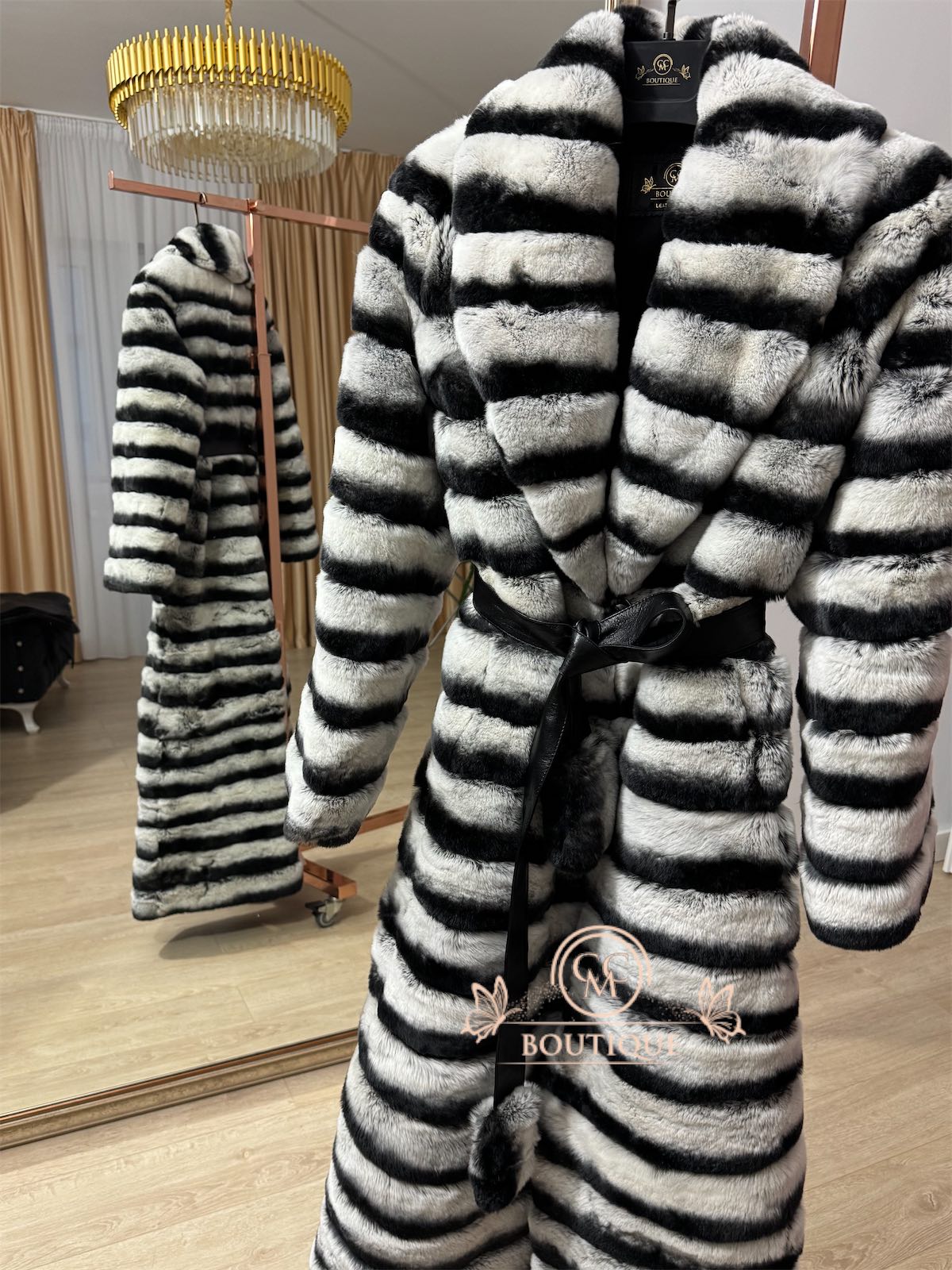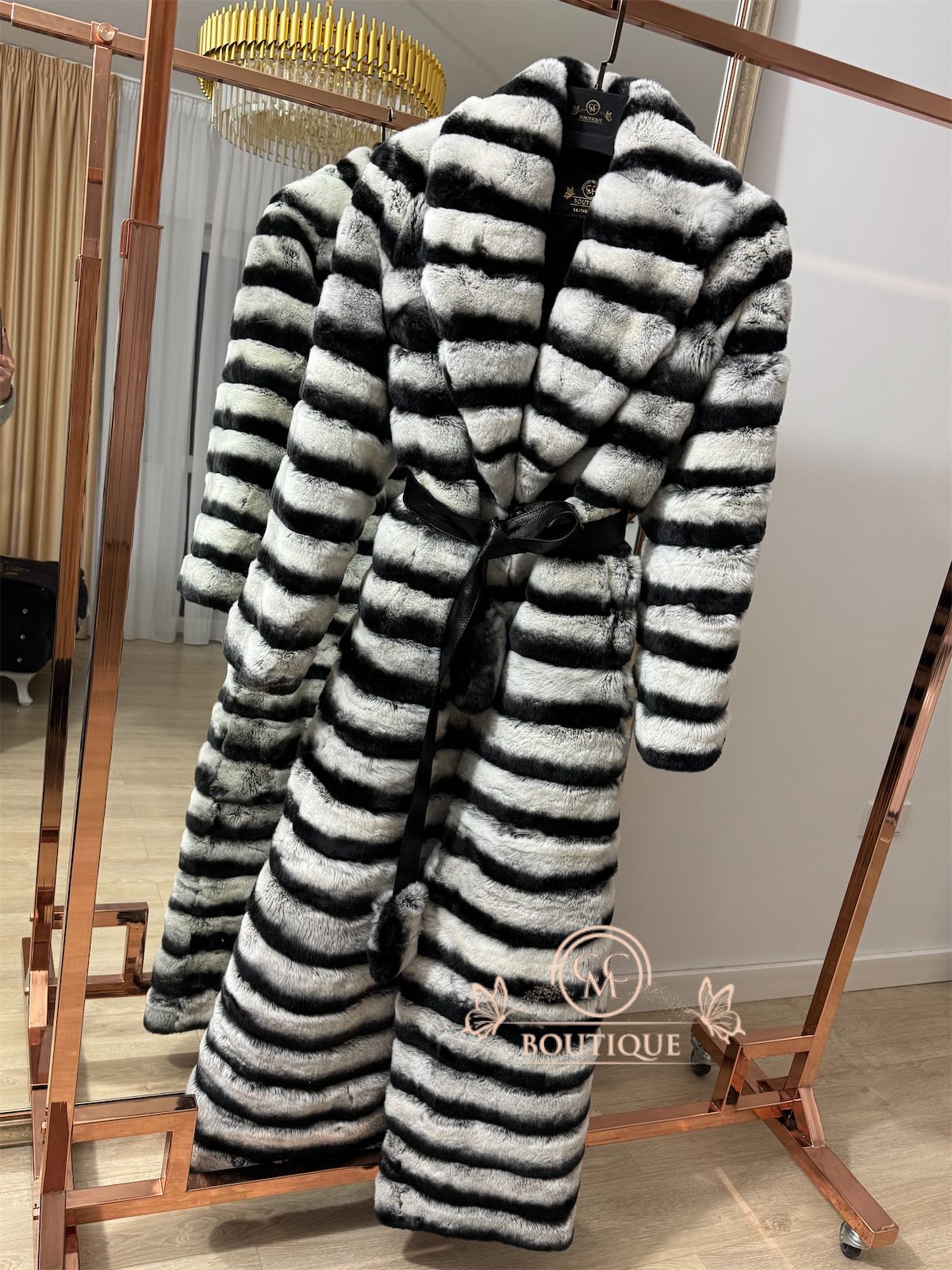 Imagine ultimate elegance in a long Chinchilla Rex Rabbit fur coat that caresses your skin with every step.
