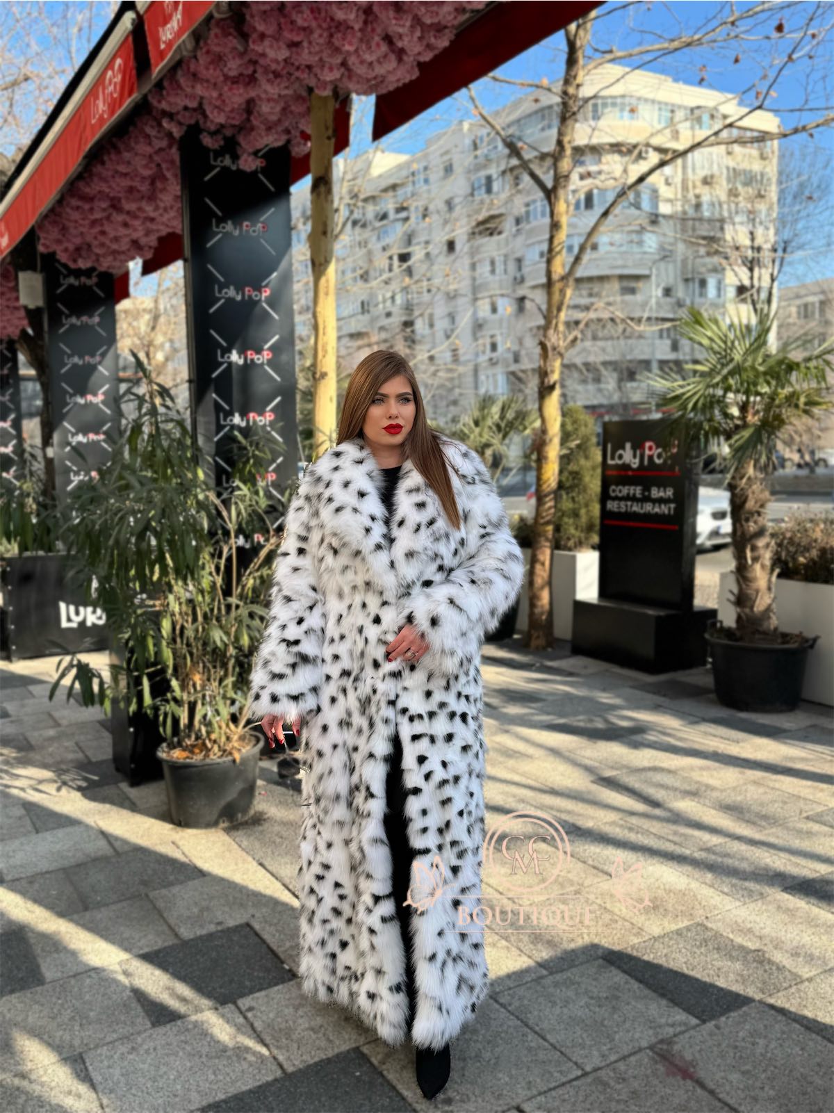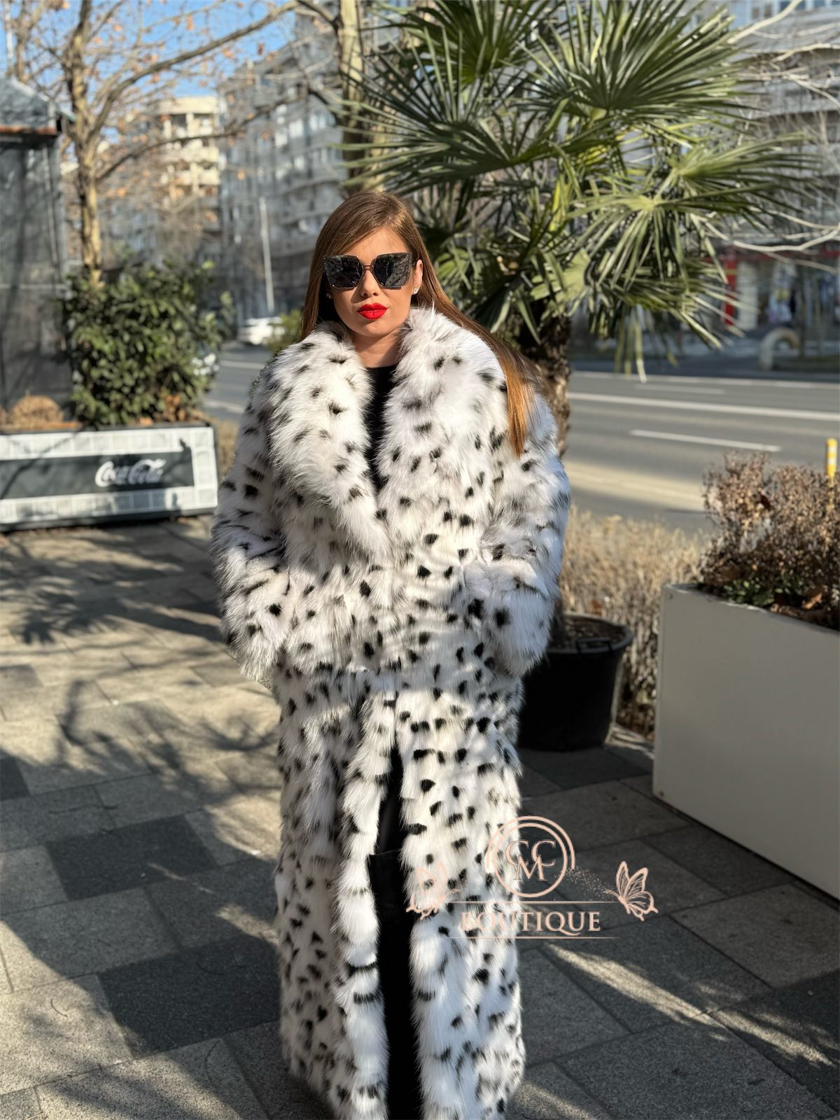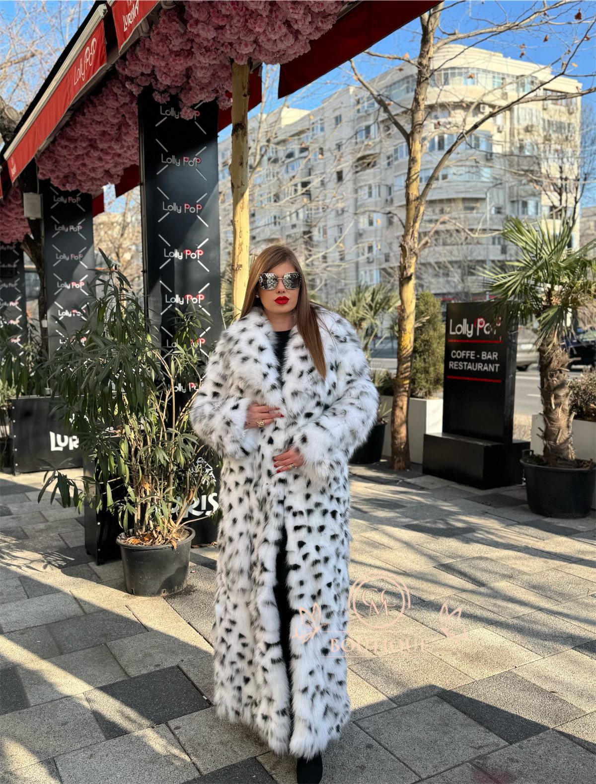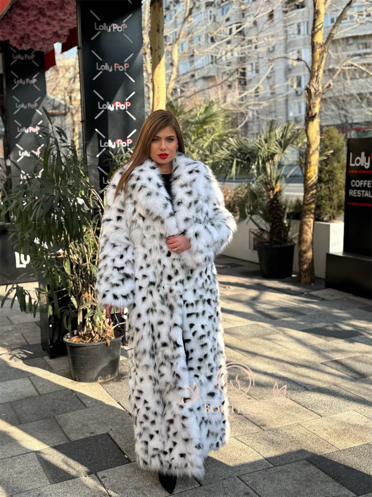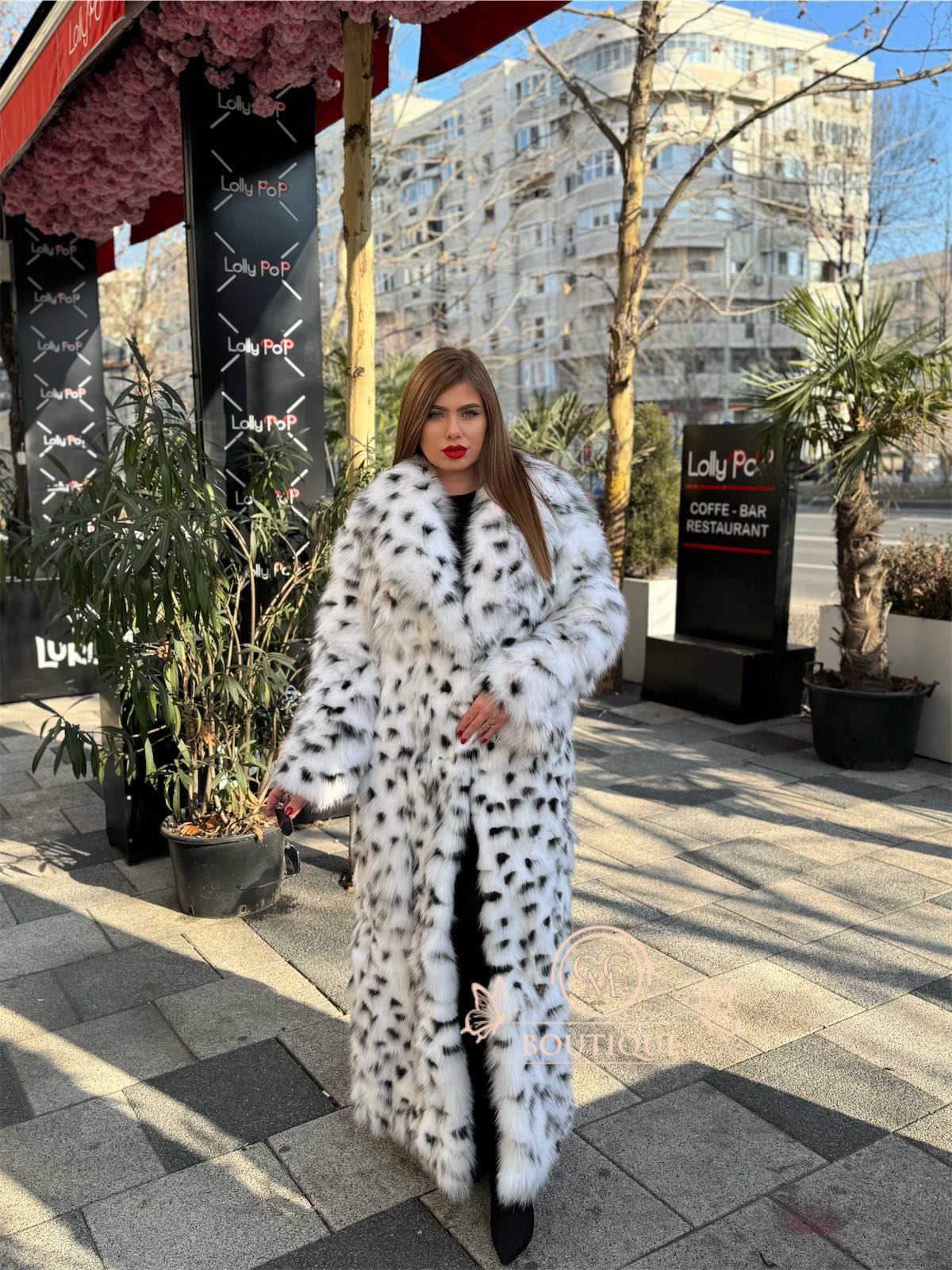 Made from carefully selected natural fox fur, the coat is hand-dyed with a lynx effect, achieving a sophisticated, cool look, with subtle plays of shades.