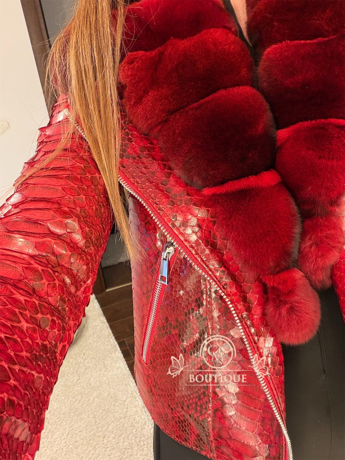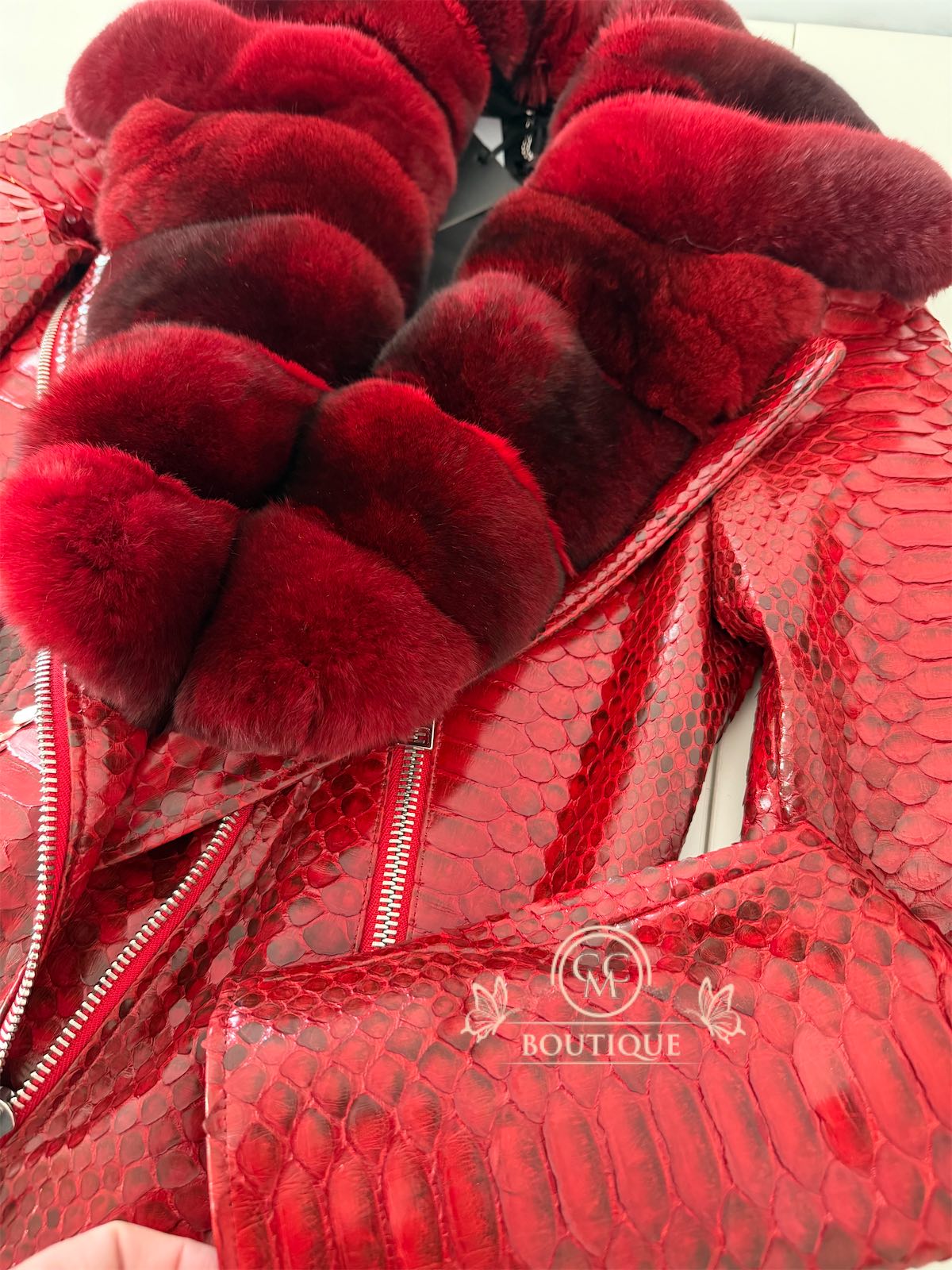 Handmade exotic python leather jacket design custom made, genuine python leather accessorized with a detachable royal chinchilla fur collar.