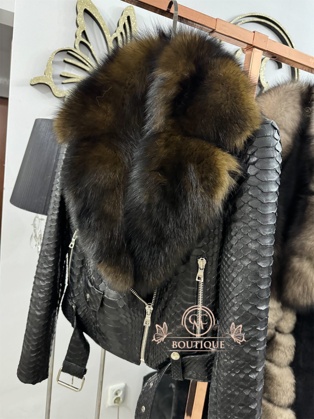Handmade exotic python leather jacket design custom made, genuine python leather accessorized with a detachable fur collar.