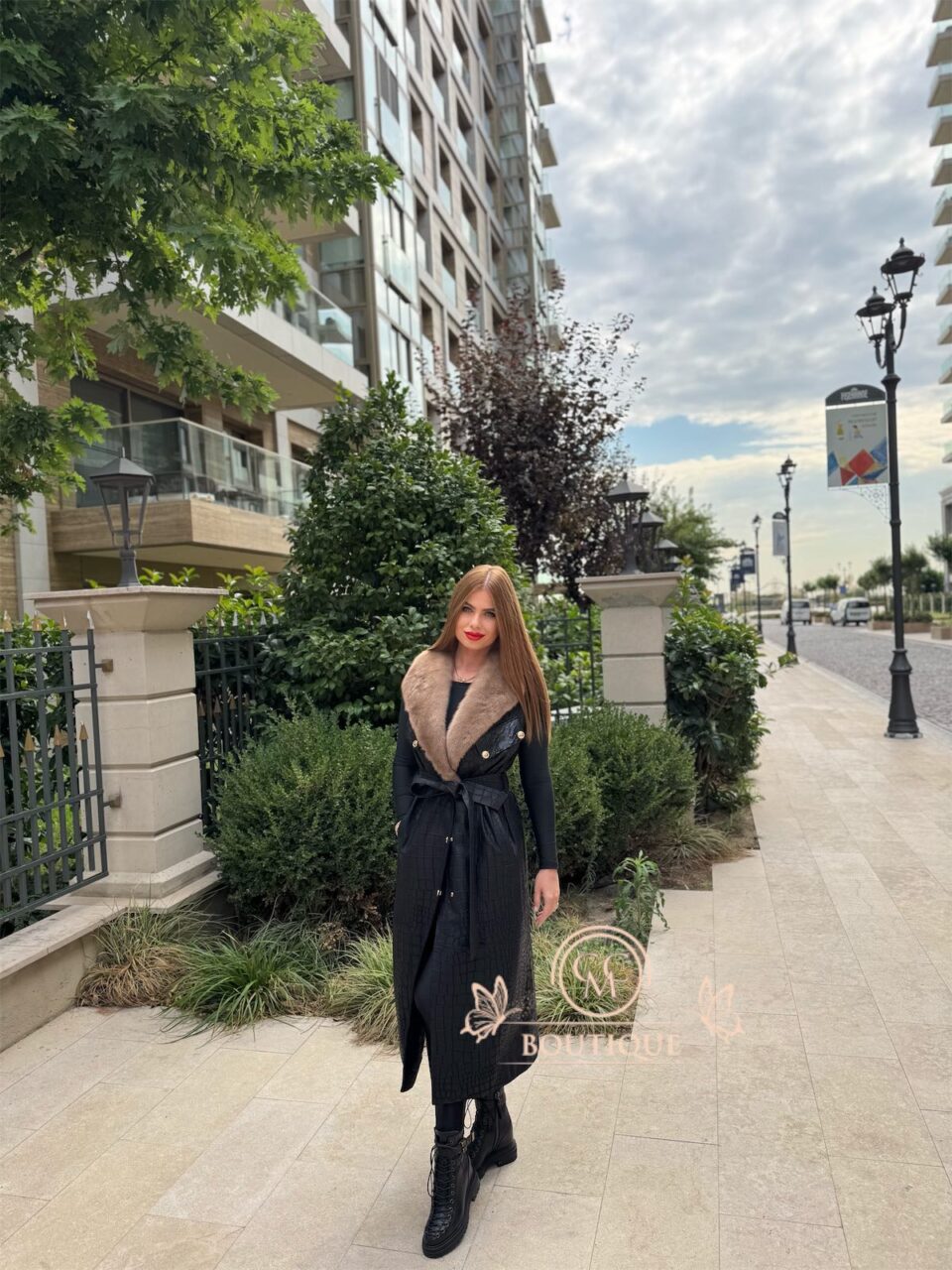 Această vestă lungă din piele naturală, cu inserții fine și textură croco, este completată de un guler amplu din blană naturală de nurcă, oferind eleganță atemporală și un sentiment de exclusivitate la fiecare purtare.