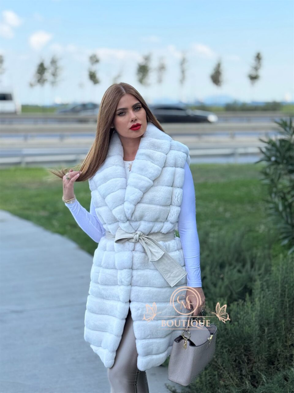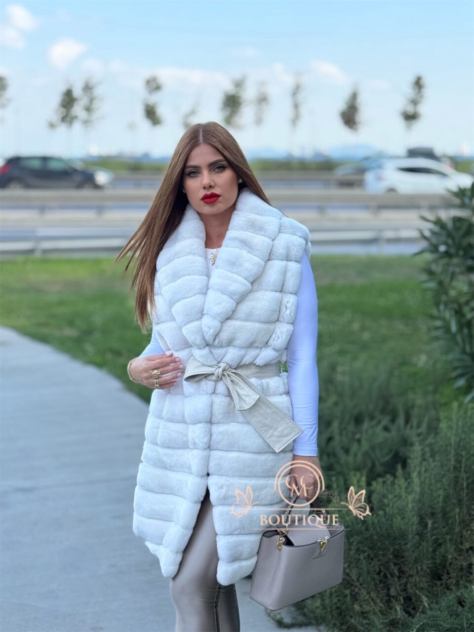 Această vestă delicată din blană de chinchilla, la fel ca pietrele prețioase , este creată pentru ocazii excepționale, trebuie protejată și îngrijită pentru a se bucura de frumusețea și strălucirea ei timp de mulți ani, modelul are o lungime de 145 de centimetri.