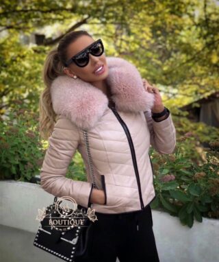 Geaca luxoasa din piele roz pudrata, accesorizata cu gluga si blana de vulpe.Piele și blană......
