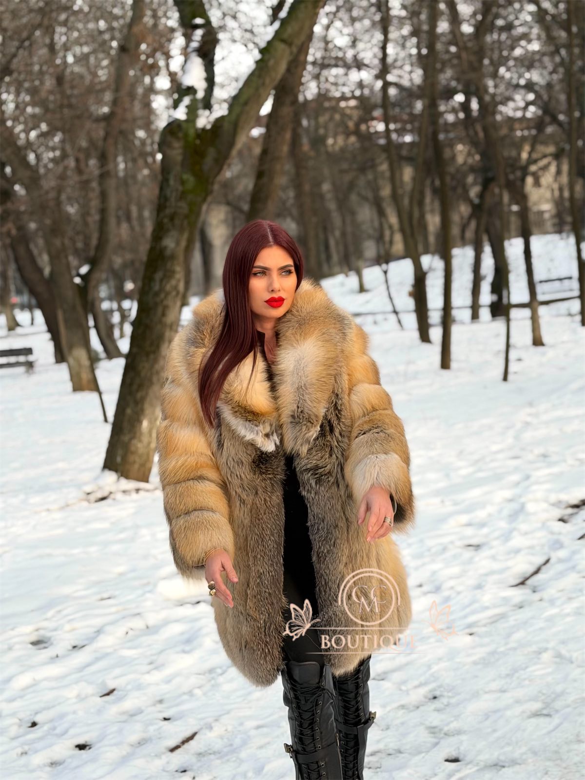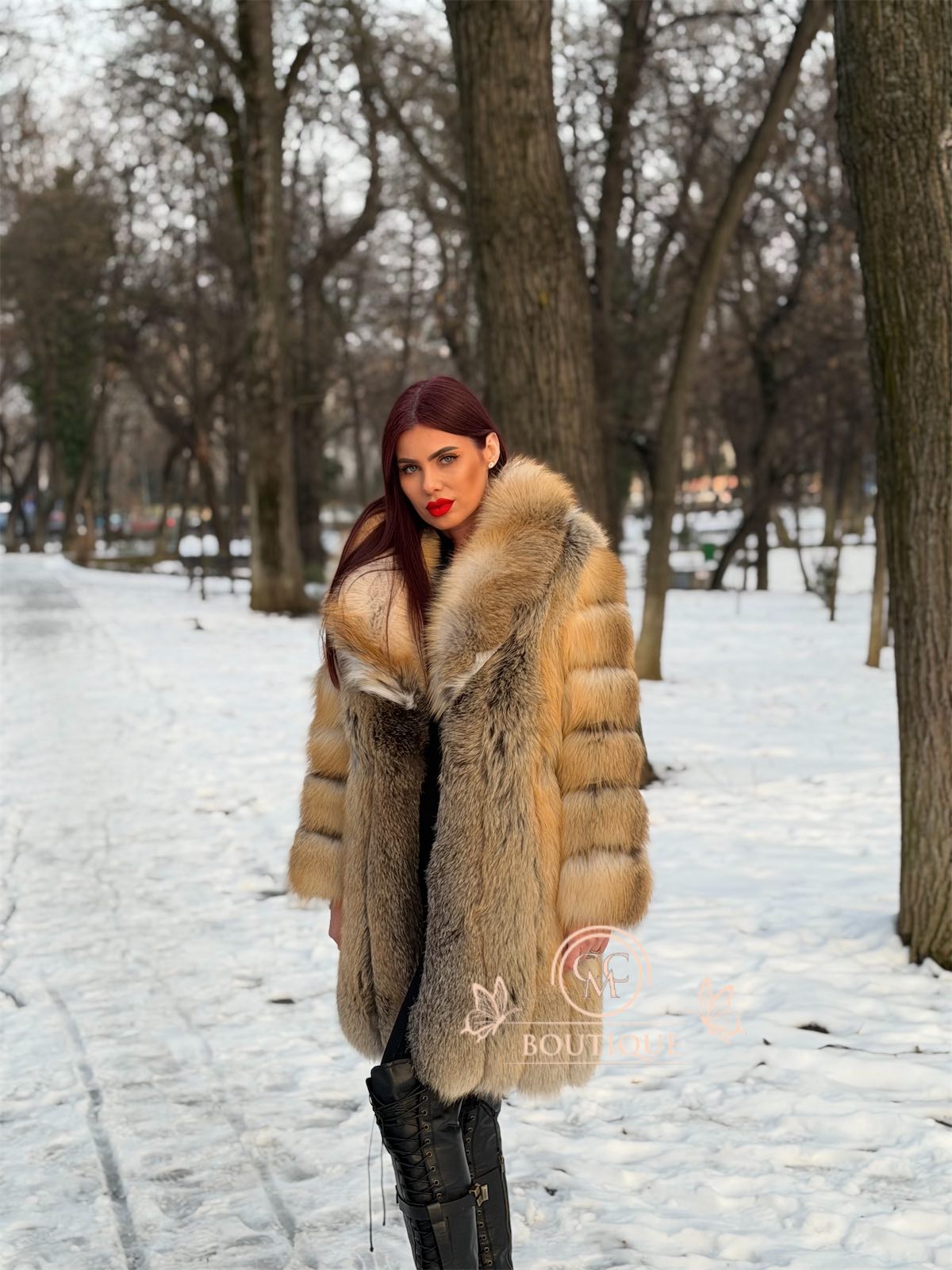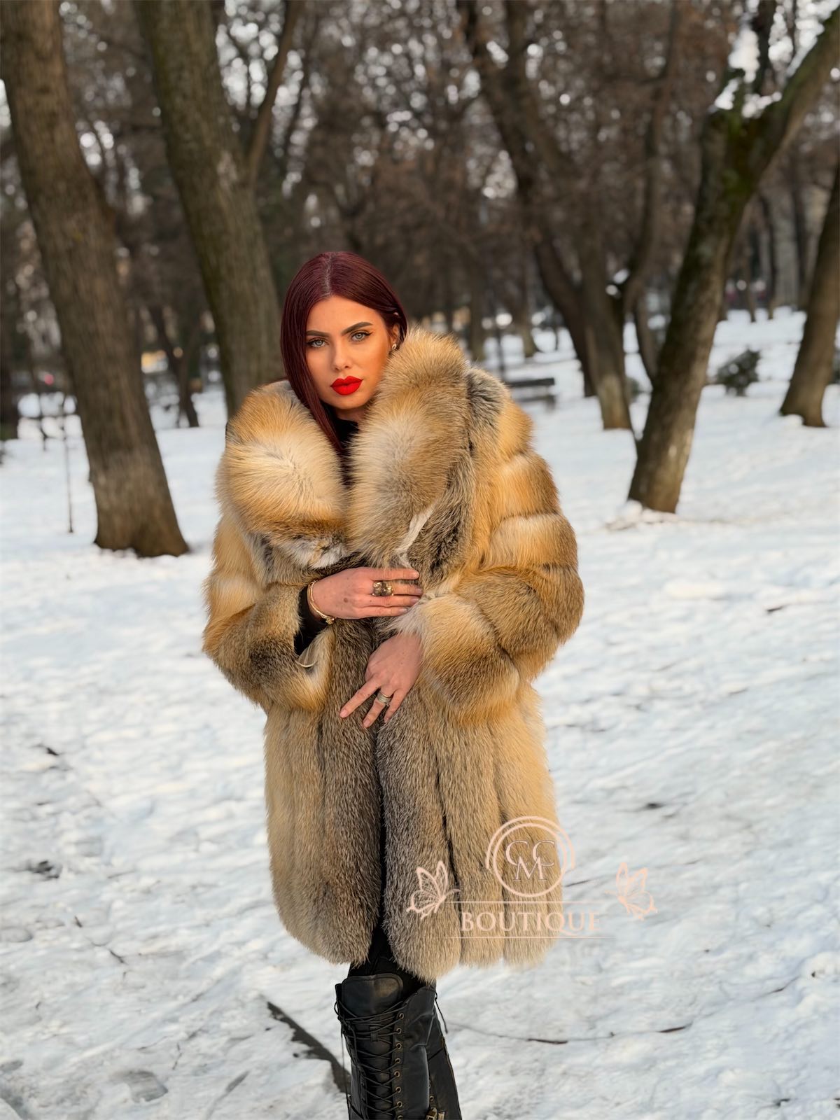 Perfectă pentru femeia care apreciază exclusivitatea și calitatea, această haină de blană de vulpe gold island devine centrul oricărei apariții.