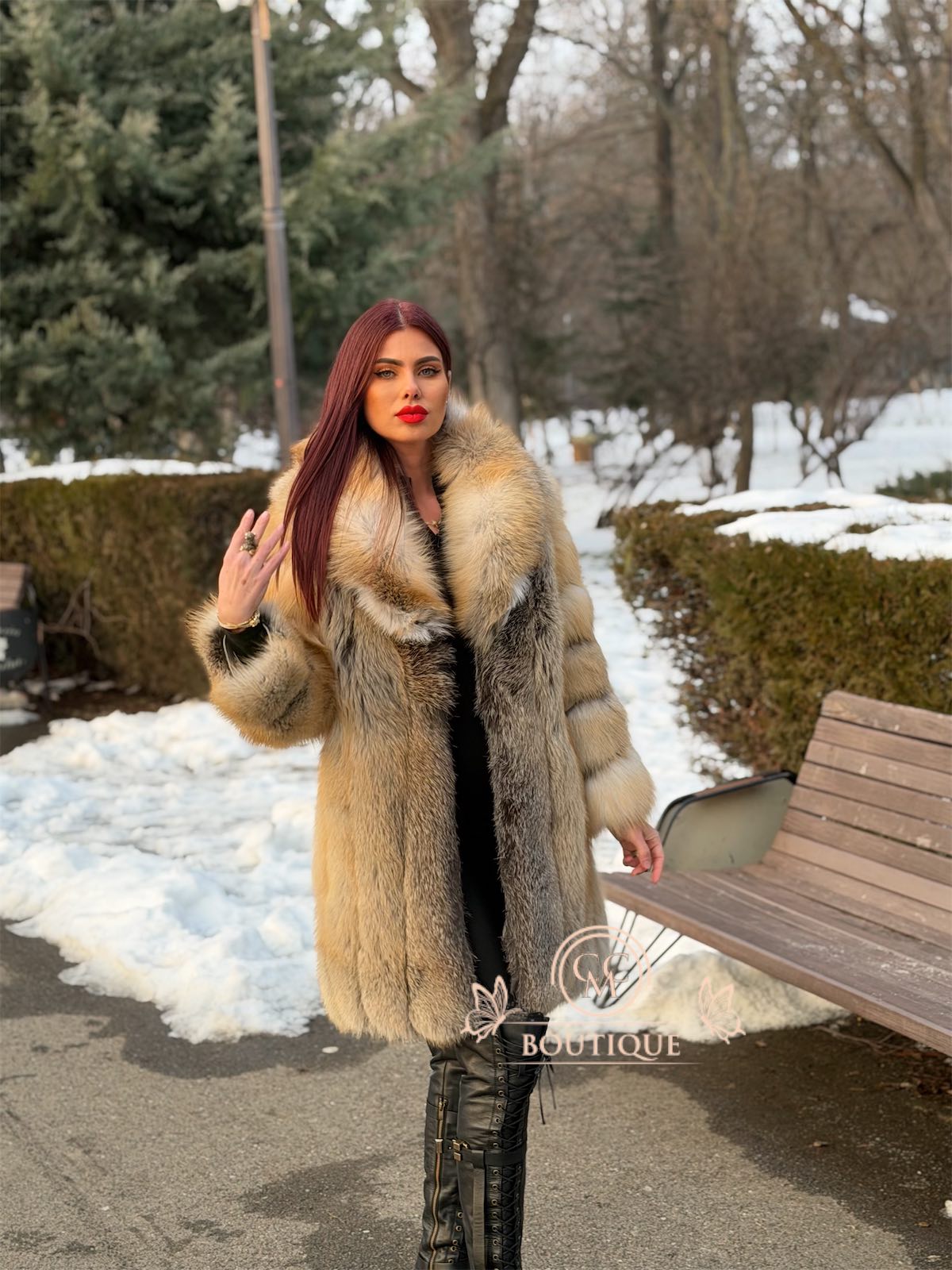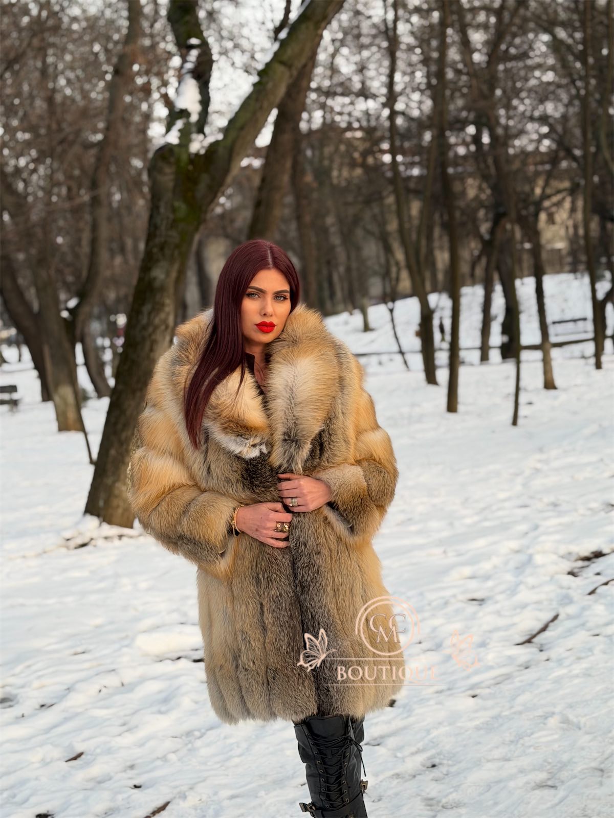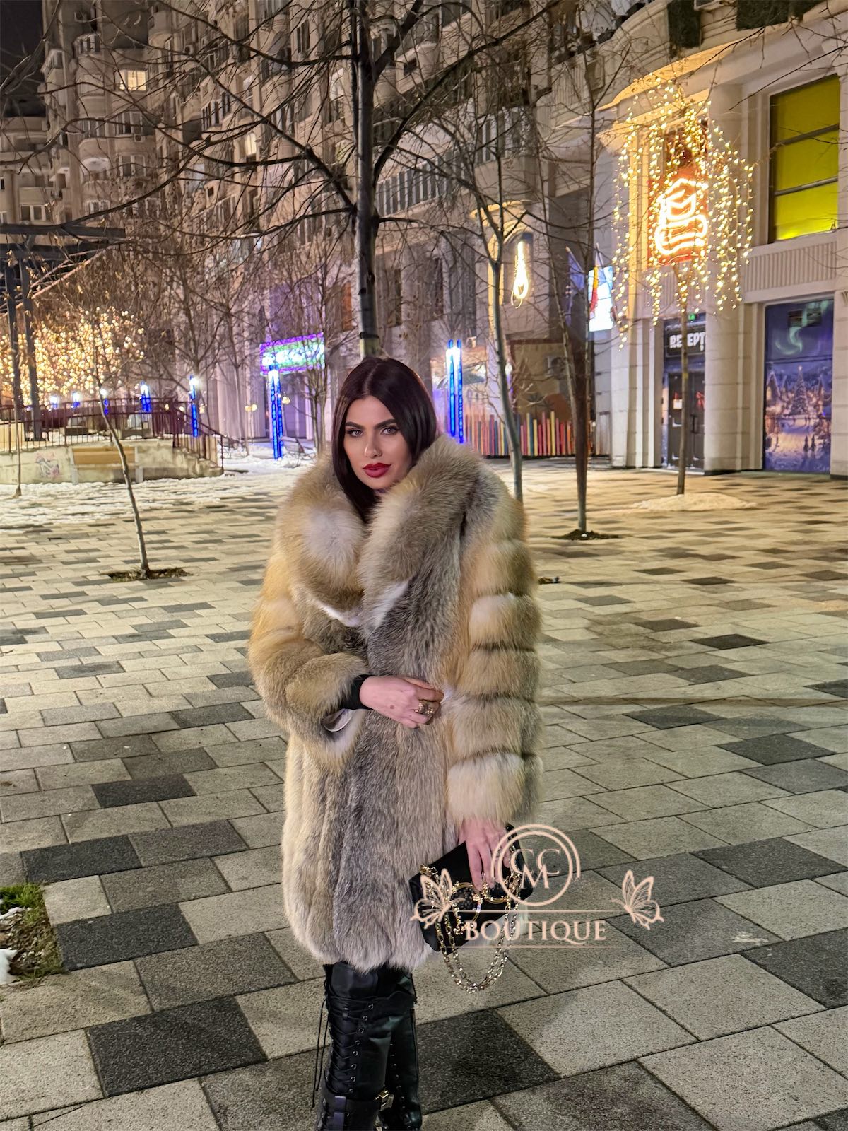 Perfectă pentru femeia care apreciază exclusivitatea și calitatea, această haină de blană de vulpe gold island devine centrul oricărei apariții.