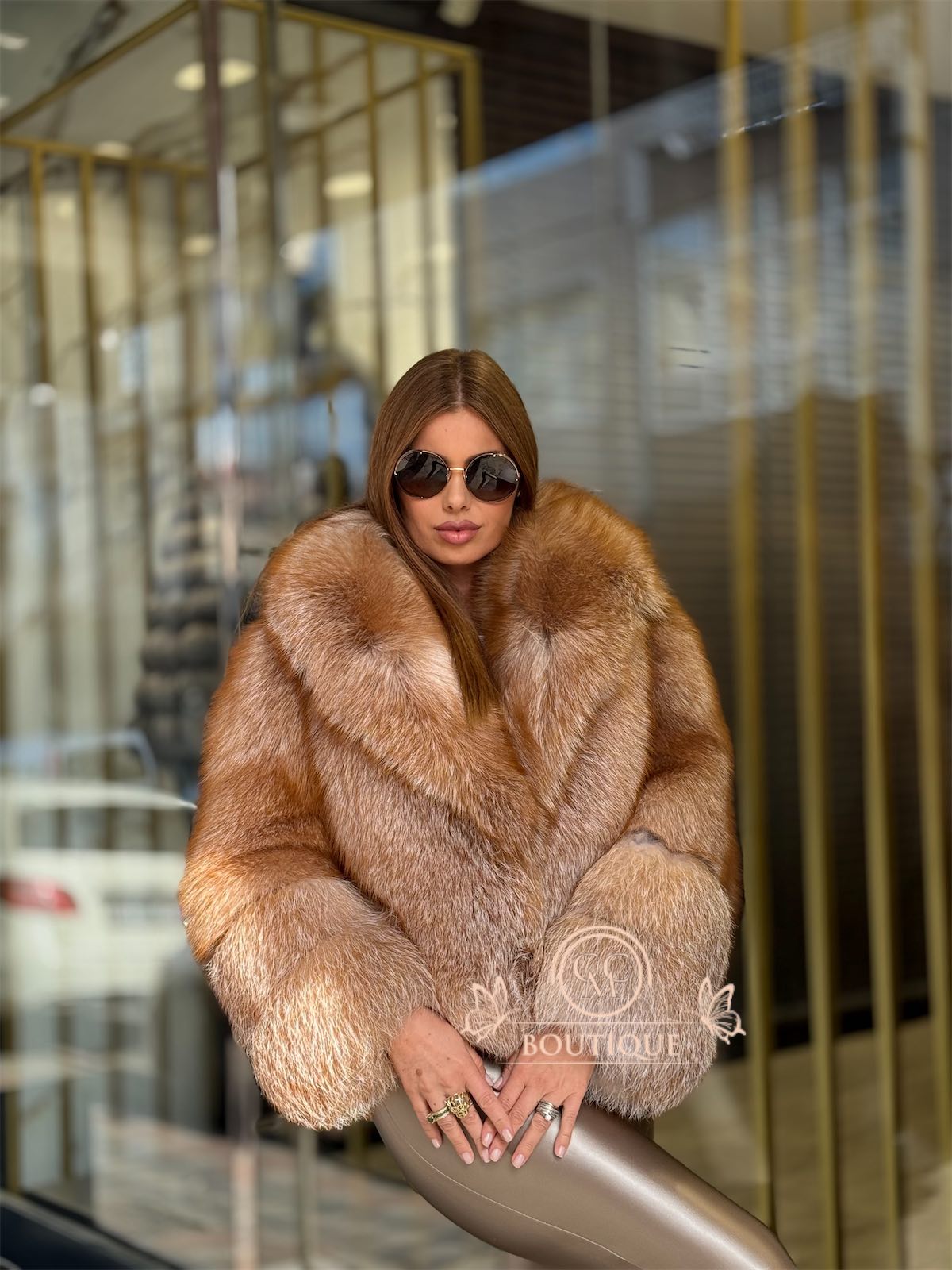 Haina din blană naturală de vulpe , de calitate premium, cu rever somptuos, este perfectă pentru a vă ține de cald cu stil, oferind un amestec unic între confort și rafinament.