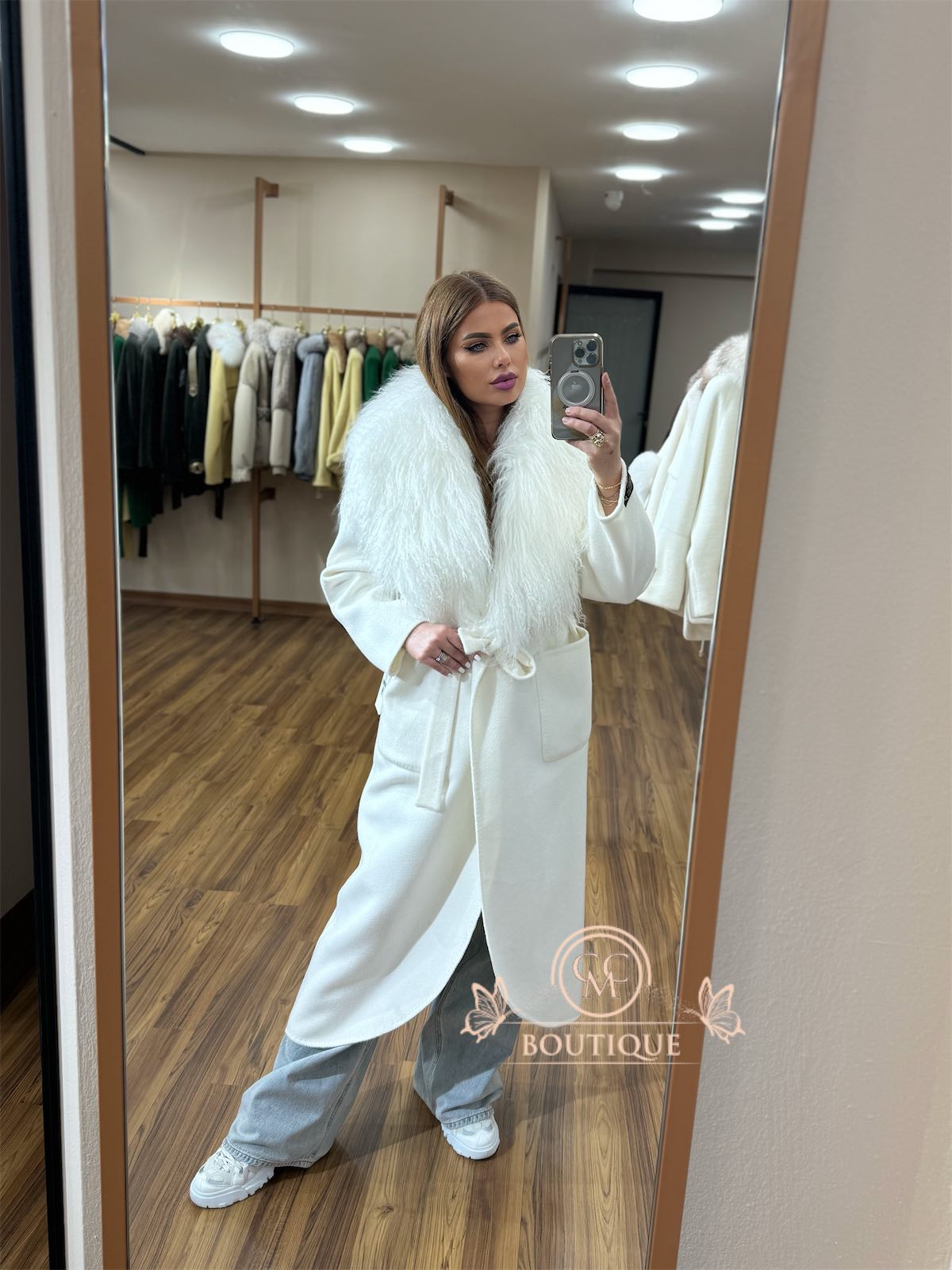Acest palton este accesorizat cu un guler din blană naturala de oaie mongoleza, care adaugă o notă de sofisticare și rafinament.