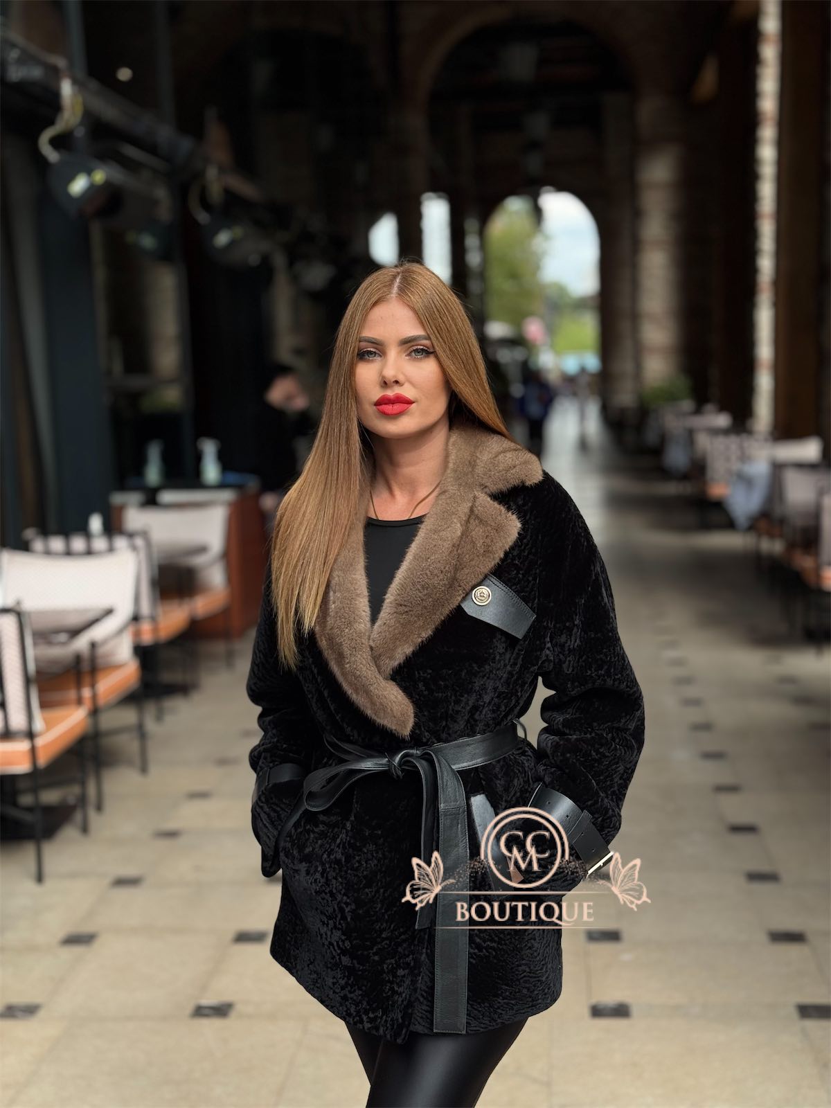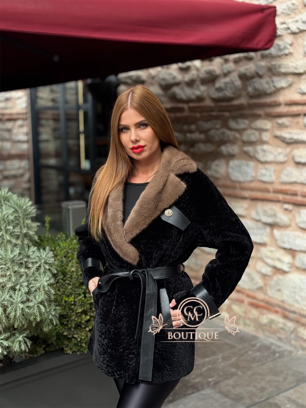 Cojoc din shearling autentic, accesorizat cu guler de vizon, realizat la comandă, conform măsurătorilor clientei, din materiale naturale premium, alese pentru textura, durabilitatea și eleganța lor.