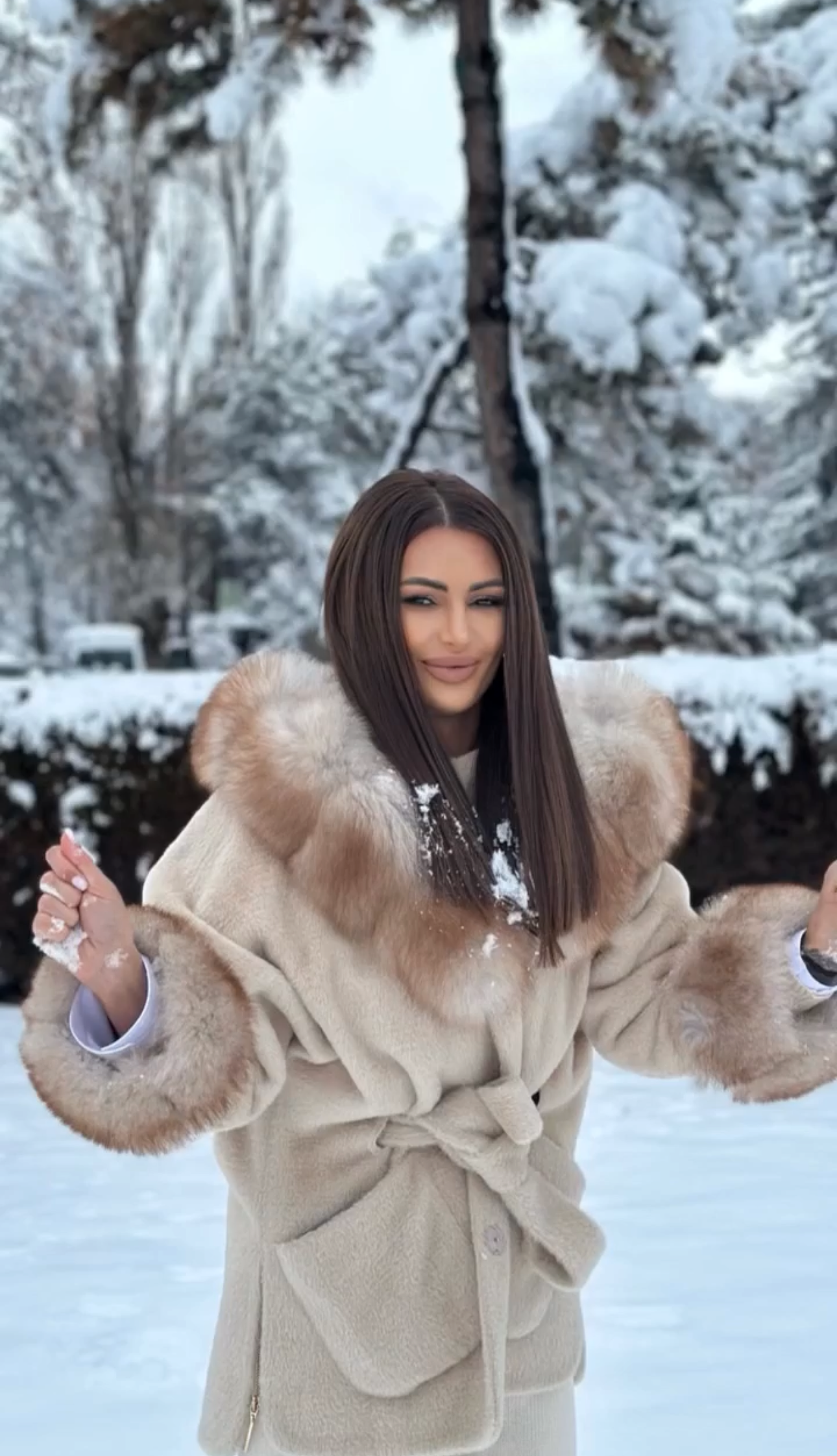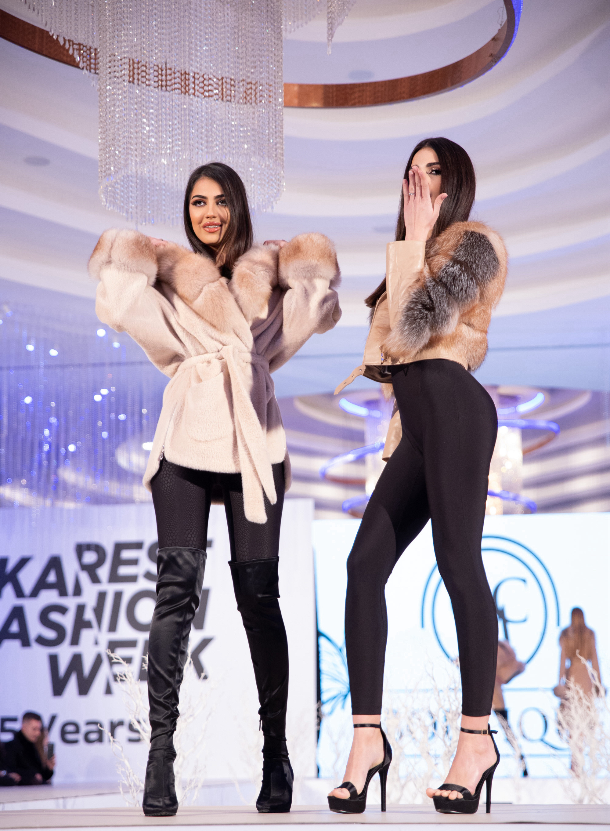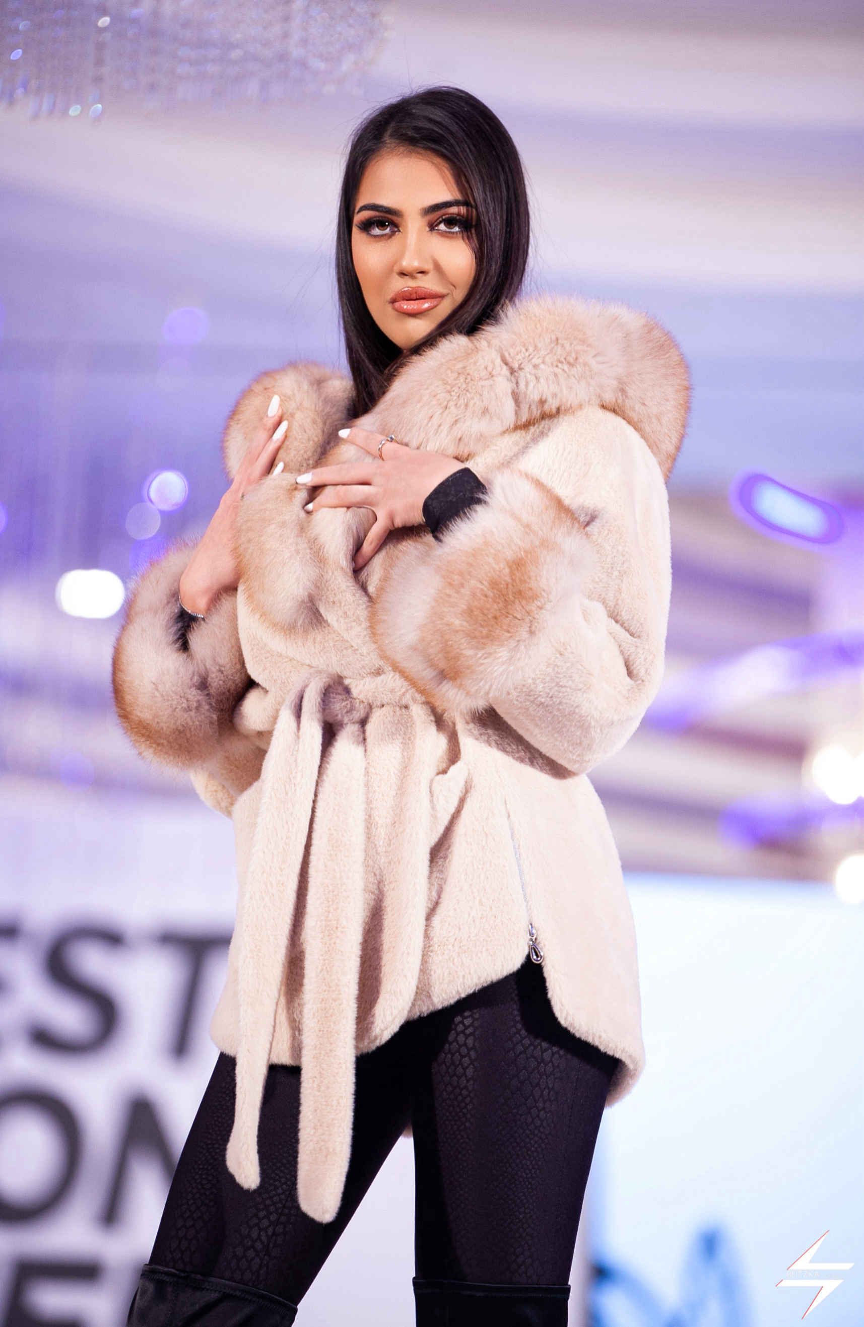 Aceasta haina este confectionata din alcantara, accesorizata cu blana de vulpe.