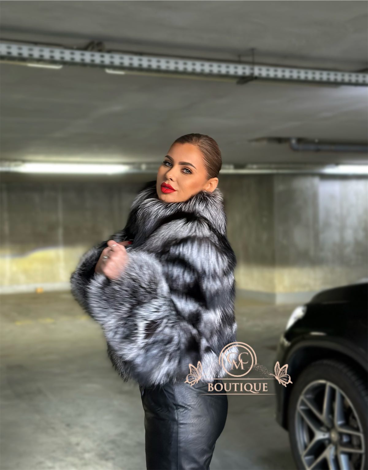 Jachetă din piele de lux, accesorizată cu un guler superb din blană detașabil.