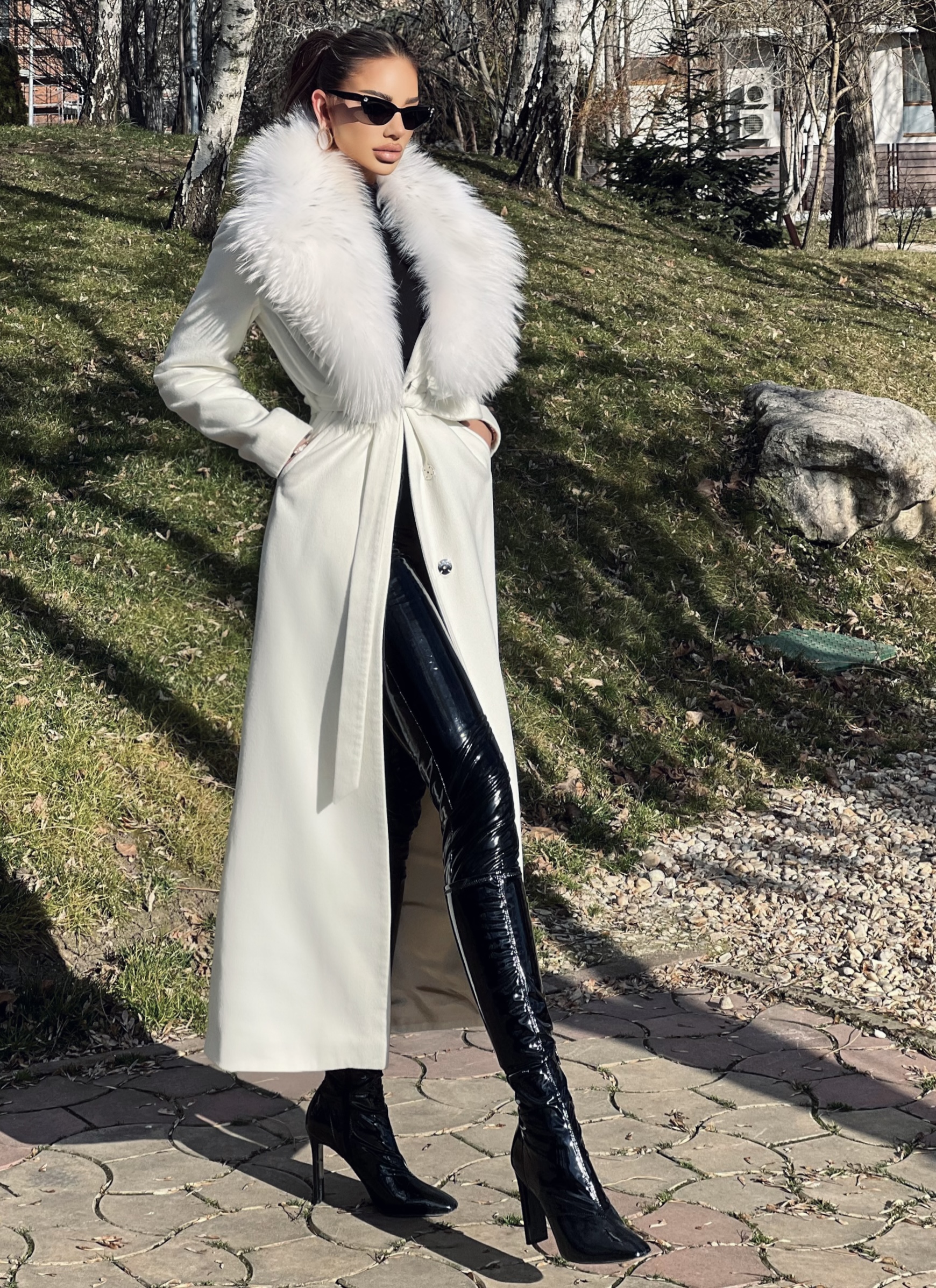 Palton din lana de cașmir, accesorizat cu blană naturală de vulpe argentiniană.