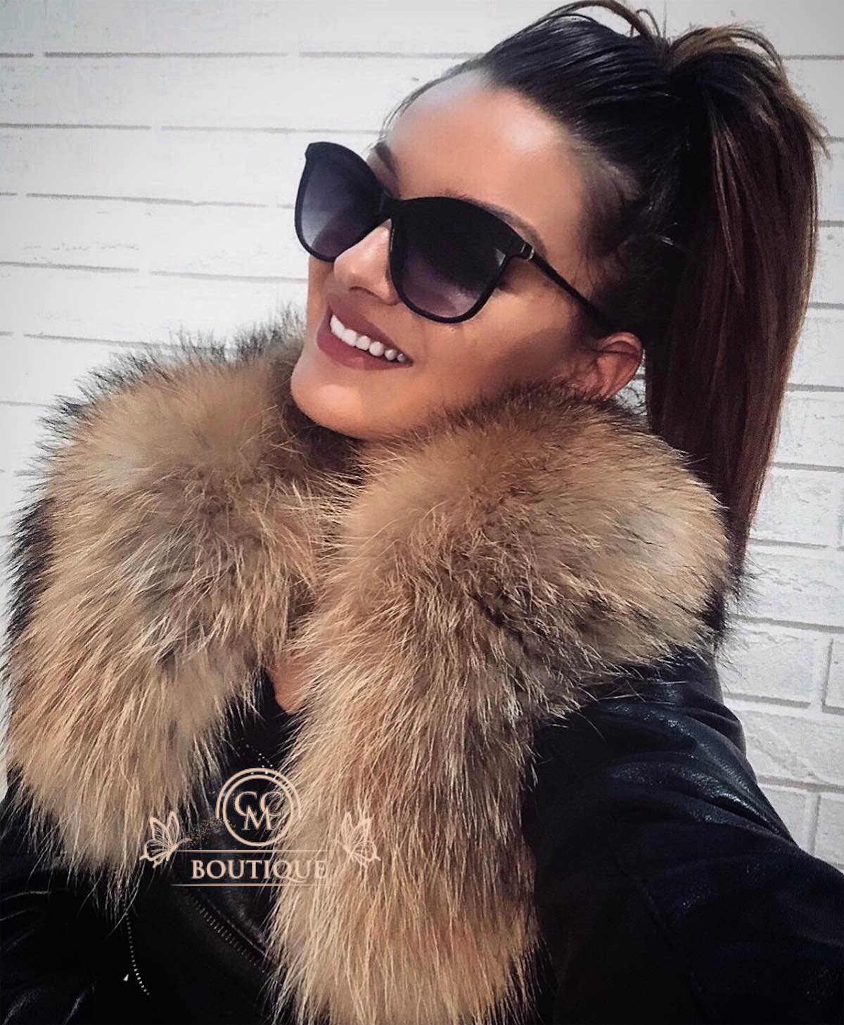 Jachetă luxoasă din piele neagră, accesorizată cu un guler de blană detașabil.
